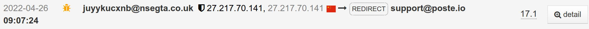 $ ls -1 2022-04-25-total 2022-04-26-total conn del tx $ grep support@poste.io *-total 2022-04-26-total:2022-04-26T07:07:24.507Z [36C26C1A-88AA-49B2-B4EA-BE43286094B6.1] 27.217.70.141:31211%NXDOMAIN () <juyykucxnb@nsegta.co.uk> -> <support@mailbox.com>(standa@humplik.cz) - [17.113239][<14499987.569241.1650956810144@mail1.siedle.de>] 250 Quarantined! (36C26C1A-88AA-49B2-B4EA-BE43286094B6.1) ...or... $ grep 27.217.70.141 *-total 2022-04-26-total:2022-04-26T07:07:24.507Z [36C26C1A-88AA-49B2-B4EA-BE43286094B6.1] 27.217.70.141:31211%NXDOMAIN () <juyykucxnb@nsegta.co.uk> -> <support@mailbox.com>(standa@humplik.cz) - [17.113239][<14499987.569241.1650956810144@mail1.siedle.de>] 250 Quarantined! (36C26C1A-88AA-49B2-B4EA-BE43286094B6.1)